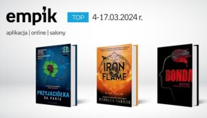 Na kolejnej liście Empiku (4-17 marca 2024 r.) totalna zmiana. Na miejscu pierwszym “Przyjaciółka” B.A. Paris (Albatros), na drugim “Iron Flame. Żelazny płomień. Empireum (tom 2) Rebecci Yarrros (Filia)”, na trzecim “Krew w piach” Katarzyny Bondy (Muza SA, Wielka Litera).