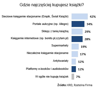 Jak wynika z badania KRD i Rzetelnej Firmy, najwięcej z nas po zakup książek wybiera się do sieciowych sklepów, wskazało tak niemal 42 proc. respondentów. Na drugim miejscu znajdują się portale aukcyjne, gdzie zaopatruje się jedna trzecia zapytanych, a na trzecim punkty z tanią książką i księgarnie internetowe (odpowiednio 29 i 28 proc. wskazań). W supermarketach kupuje 19 proc., a w niezależnych księgarniach stacjonarnych jedynie niecałe 17 proc. Polaków.