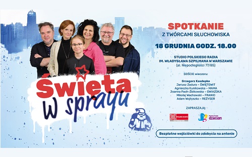 Polskie Radio Dzieciom, Teatr Polskiego Radia zapraszają na premierę świątecznego słuchowiska „Święta w sprayu” popularnego pisarza dla dzieci, Grzegorza Kasdepke, w reżyserii Adama Wojtyszki. Premiera już dziś, 16 grudnia o godz. 20.00 na antenie Polskiego Radia Dzieciom, a wyjątkowe spotkanie z jego autorem, Grzegorzem Kasdepke i pozostałymi twórcami w środę, 18 grudnia o godz. 18.00. Wstęp bezpłatny!