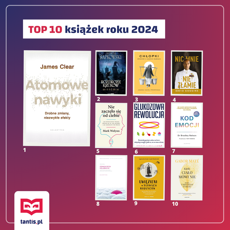 Klienci tantis.pl w minionym roku najchętniej sięgali po poradniki z dziedziny rozwoju oraz książki poruszające tematykę zdrowia fizycznego i psychicznego. Absolutnym bestsellerem okazała się książka Jamesa Cleara – Atomowe nawyki. Drobne zmiany, niezwykłe efekty (Wydawnictwo Galaktyka). Czytelnicy docenili ją za praktyczne wskazówki dotyczące zmiany codziennych nawyków. Na miejscu drugim znalazła się długo wyczekiwana przez fanów powieść Andrzeja Sapkowskiego, Rozdroże kruków, 10 tom serii o Wiedźminie. Kolejne miejsce zajęły Chłopki. Opowieść o naszych babkach, reportaż Joanny Kuciel-Frydryszak.