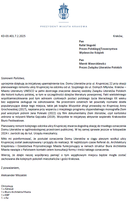 18 grudnia 2024 roku Rafał Skąpski, prezes Polskiego Towarzystwa Wydawców Książek, oraz Marek Wawrzkiewicz, prezes Związku Literatów Polskich, przekazali na ręce Aleksandra Miszalskiego, prezydenta Krakowa, list w sprawie upamiętnienia kamienicy przy ul. Krupniczej 22 w Krakowie. Właśnie wpłynęła odpowiedź.