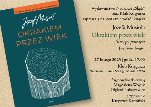 Wydawnictwo Naukowe “Śląsk” i Klub Księgarza zapraszają na wieczór promocyjny książki Józefa Musioła Okrakiem przez wiek. Strzępy pamięci