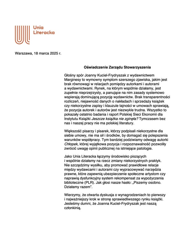A oto stanowisko Unii Literackiej (jej członkiem jest Joanna Kuciel-Frydryszak).
