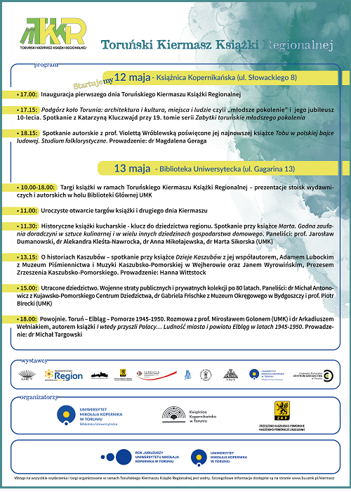 Biblioteka Uniwersytecka UMK, Książnica Kopernikańska oraz Toruński Oddział Zrzeszenia Kaszubsko-Pomorskiego zapraszają na targi książki w ramach XI Toruńskiego Kiermaszu Książki Regionalnej. Wydarzenie odbędzie się 12 i 13 maja 2025 r.
