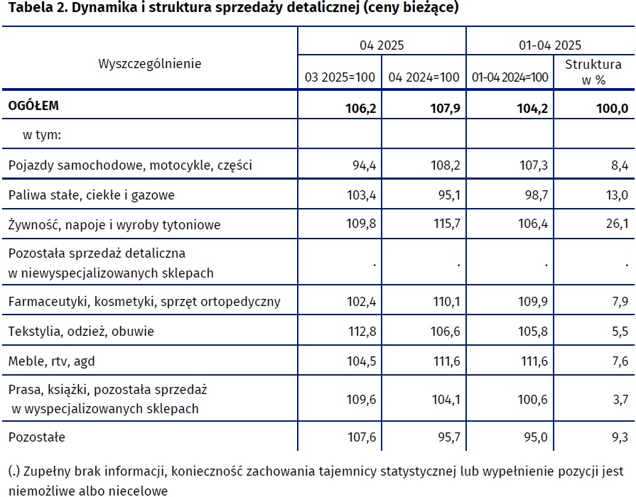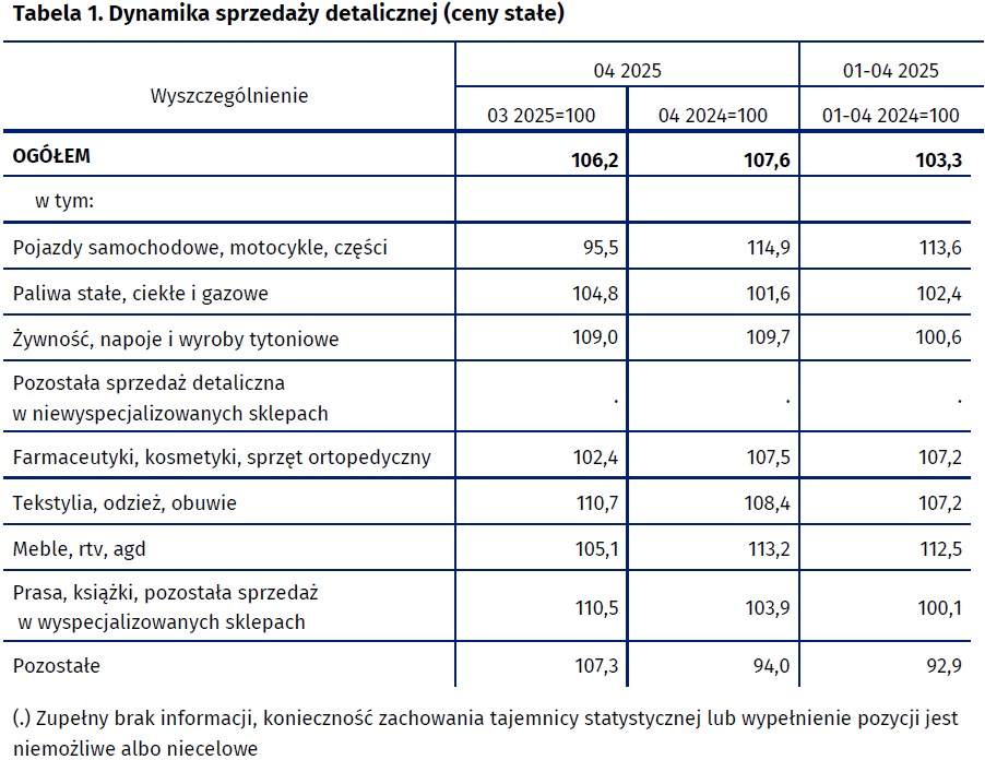 W kwietniu 2025 r. znaczny wzrost sprzedaży detalicznej (w cenach stałych) w porówna-niu z analogicznym okresem 2024 r. odnotowano w grupach: „pojazdy samochodowe, motocykle, części” (o 14,9%), „meble, rtv, agd” (o 13,2%), „żywność, napoje i wyroby tytoniowe” (o 9,7%), „tekstylia, odzież, obuwie” (o 8,4%), „farmaceutyki, kosmetyki, sprzęt ortopedyczny” (o 7,5%).