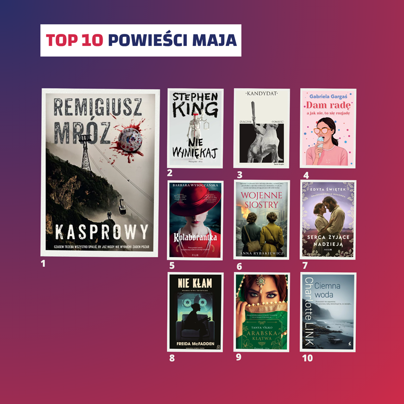 Majowe bestsellery w księgarni internetowej tantis.pl pokazują duże zainteresowanie zarówno literaturą popularną, jak i reportażem. Wśród najchętniej wybieranych powieści znalazł się Kasprowy Remigiusza Mroza, Nie wymiękaj Stephena Kinga oraz Kandydat Jakuba Żulczyka. Czytelnicy sięgali również po powieści obyczajowe i thrillery, takie jak Dam radę, a jak nie, to się rozjadę Gabrieli Gargaś, Kolaborantka Barbary Wysoczańskiej czy Nie kłam Freidy McFadden.