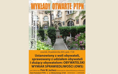 Poznańskie Towarzystwo Przyjaciół Nauk zaprasza na wykład pt. „Ustanowiony z woli obywateli, sprawowany z udziałem obywateli i służący obywatelom: Obywatelski Wymiar Sprawiedliwości (OWS)”.