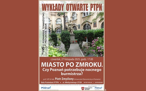 Poznańskie Towarzystwo Przyjaciół Nauk zaprasza na wykład pt. „Miasto po zmroku. Czy Poznań potrzebuje nocnego burmistrza?”.