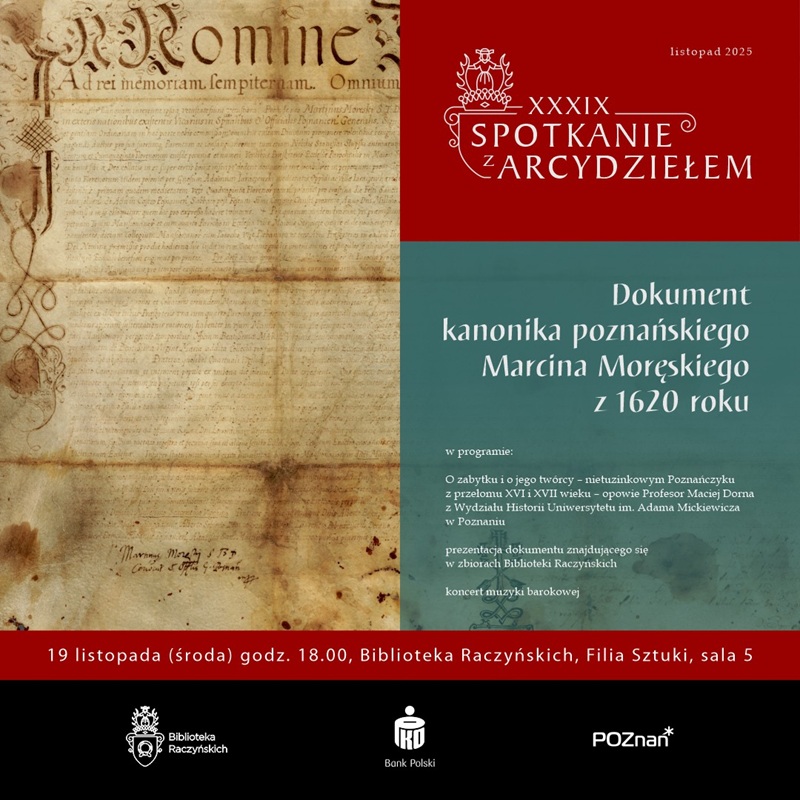 Biblioteka Raczyńskich i PKO Bank Polski zapraszają 19 listopada na prezentację nowego nabytku Zbiorów Specjalnych poznańskiej książnicy – dokumentu kanonika, wikariusza generalnego i oficjała poznańskiego Marcina Moręskiego z dnia 10 lipca 1620 r.