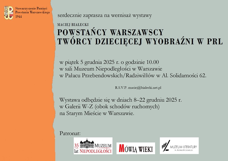 W piątek 5 grudnia 2025 roku o godzinie 10.00 w głównej siedzibie Muzeum Niepodległości w Warszawie odbędzie się wernisaż wystawy Macieja Białeckiego „Powstańcy Warszawscy – twórcy dziecięcej wyobraźni w PRL”.