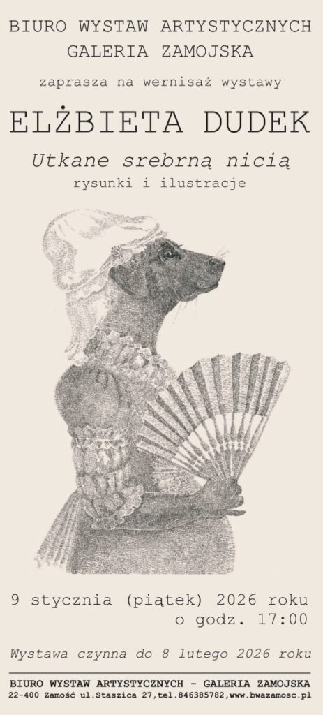 BWA Galeria Zamojska zaprasza na wernisaż wystawy Elżbiety Dudek zatytułowanej “Utkane srebrną nicią” dnia 9 stycznia 2026 roku, o godz. 17.00.