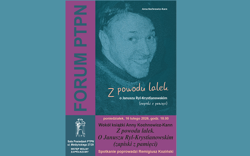 Poznańskie Towarzystwo Przyjaciół Nauk zaprasza na wydarzenie z cyklu Forum PTPN: Z powodu lalek – wokół książki Anny Kochnowicz-Kann „Z powodu lalek. O Januszu Ryl-Krystianowskim. (zapiski z pamięci)”, wydanej w 2024 r. przez Wydawnictwo Miejskie Posnania.
