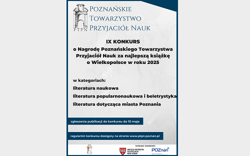 Poznańskie Towarzystwo Przyjaciół Nauk ogłasza IX edycję konkursu o Nagrodę Poznańskiego Towarzystwa Przyjaciół Nauk za najlepszą książkę o Wielkopolsce w roku 2025. Celem ustanowionej nagrody jest wyróżnienie i promocja najważniejszych dzieł, które podejmują tematy związane z Wielkopolską oraz propagowanie czytelnictwa i popularyzacji wiedzy o regionie.
