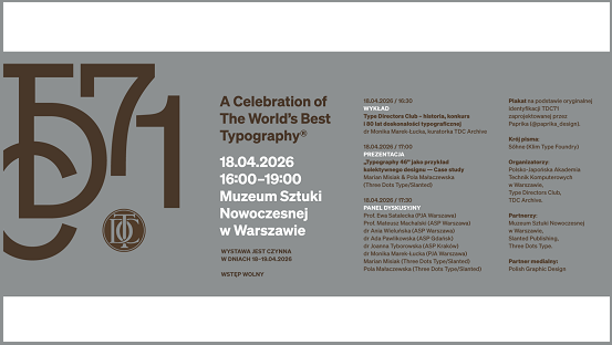 O historii TDC i konkursie opowiadać będzie kuratorka TDC Archive, dr Monika Marek-Łucka (PJATK). Marian Misiak oraz Pola Małaczewska z Three Dots Type/Slanted zaprezentują publikację pokonkursową Typography 46, przedstawiając cały proces projektowy. Natomiast na scenie zasiądzie grono specjalistów z dziedziny typografii — Prof. Ewa Satalecka (PJATK Warszawa), Prof. Mateusz Machalski (ASP Warszawa), dr Ania Wieluńska (ASP Warszawa), dr Ada Pawlikowska (ASP Gdańsk), dr Joanna Tyborowska (ASP Kraków), dr Monika Marek-Łucka (PJATK Warszawa), Marian Misiak, Pola Małaczewska — którzy wspólnie będą komentować nagrodzone projekty i dyskutować o współczesnych wyzwaniach typograficznych.