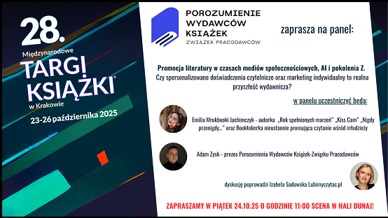 Podczas 28. Międzynarodowych Targów Książki w Krakowie Porozumienie Wydawców Książek – Związek Pracodawców zaprasza na panel: Promocja literatury w czasach mediów społecznościowych, AI i pokolenia Z. Czy spersonalizowane doświadczenia czytelnicze oraz marketing indywidualny to realna przyszłość wydawnicza? Współczesny świat cyfrowy redefiniuje sposób, w jaki literatura jest tworzona, promowana i odbierana. Media społecznościowe, sztuczna inteligencja oraz […]