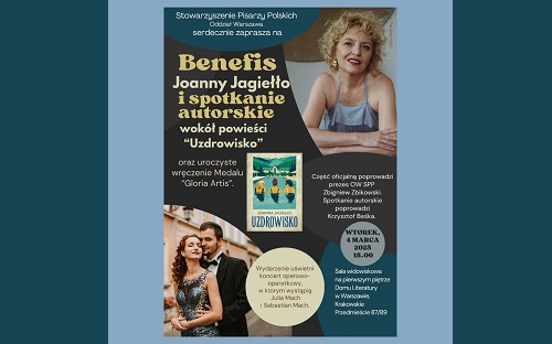 Oddział Warszawa Stowarzyszenia Pisarzy Polskich serdecznie zaprasza 4 marca o godz. 18:00 na Benefis Joanny Jagiełło do Domu Literatury w Warszawie, przy ul. Krakowskie Przedmieście 87/89. Program wieczoru: Część oficjalną wieczoru poprowadzi prezes OW SPP Zbigniew Zbikowski, spotkanie autorskie poprowadzi Krzysztof Beśka. Będzie możliwość zakupu książki „Uzdrowisko” oraz innych książek autorki. Joanna Jagiełło – z […]